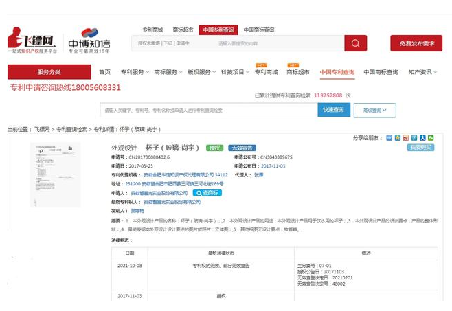 一审法院认定的事实:富光公司于2017年3月23日向国家知识产权局申请了“杯子(玻璃-尚宇)”外观设计专利,该局于2017年11月3日授予专利权,专利号为ZL201730088402.0。专利文件通过主视图、仰视图、俯视图、和立体图对产品外观设计予以展示,专利简要说明指出外观设计要点为产品的整体形状、指定立体图为最能表明产品设计要点的图片,根据涉案专利证书附图显示,该专利产品为圆柱形双层玻璃杯,杯口处设有网孔式茶漏,从仰视图角度看杯盖顶部为圆形、圆心附近有一金属光泽的圆环状设计,杯盖边缘有类环形凹槽设计,附有环形提手,从立体图角度看杯盖下部靠近杯身处有一金属光泽的圆环状设计。该专利目前处于有效状态。2018年5月17日,国家知识产权局出具的《外观设计专利评价报告》显示,涉案专利未发现存在不符合授予专利权条件的缺陷。